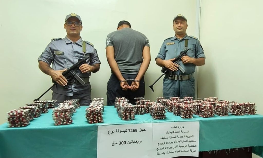 في إطار المهام الحمائية المنوطة بجهاز الجمارك الجزائرية، وكذا الجهود الميدانية المتواصلة لوحداته العملياتية، تمكن أعوان الفرقة المتعددة المهام للجمارك بالمسيلة التابعة لمصالح مفتشية الأقسام للجمارك ببرج بوعريريج، بإقليم اختصاص المديرية الجهوية للجمارك بسطيف، من إحباط محاولة تهريب بضاعة محظورة تمثلت في 7469 قرص مهلوس من نوع بريغابالين (300 ملغ) ، تم ضبطها إثر تفتيش دقيق لسيارة سياحية، كما تم حجز سيارة سياحية استعملت في التهريب، مع توقيف المخالف وتقديمه أمام الجهات القضائية المختصة.
