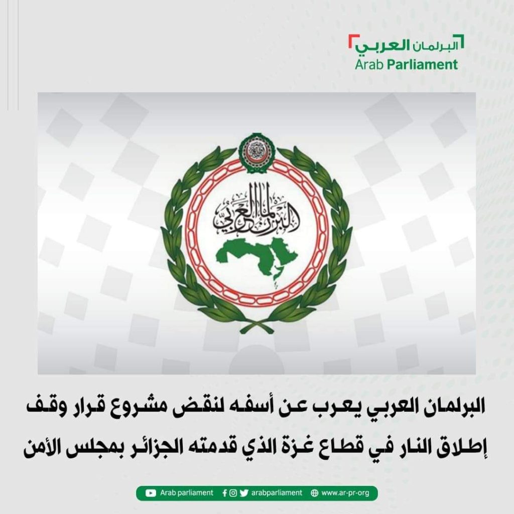 أعرب البرلمان العربي عن أسفه الشديد لنقض مشروع القرار الذي يدعو إلى الوقف الفوري لإطلاق النار في قطاع غزة ومحيطها، والذي تقدّمت به الجمهورية الجزائرية الديمقراطية الشعبية في مجلس الأمن نيابة عن الدول العربية، محذرا من خطورة إبقاء الوضع على ماهو عليه والاتجاه به نحو التصعيد دون تحريك ساكن من المجتمع الدولي ومجلس الأمن والانصياع لآلة الحرب الإسرائيلية.