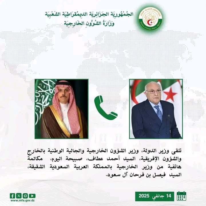 تلقى وزير الدولة، وزير الشؤون الخارجية والجالية الوطنية بالخارج والشؤون الإفريقية، السيد ” احمد عطاف ” ، صباح اليوم مكالمة هاتفية من وزير الخارجية بالمملكة العربية السعودية، السيد ” فيصل بن فرحان آل سعود”.