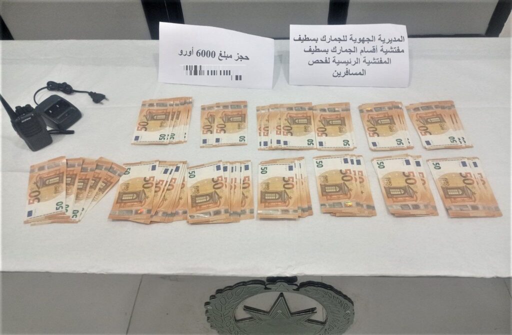 في سياق الجهود الميدانية الحثيثة للمصالح العملياتية للفرق الجمركية، تمكن أعوان المفتشية الرئيسية لفحص المسافرين بالمطار الدولي 08 ماي 1945 بسطيف، التابعة لمصالح مفتشية أقسام الجمارك بسطيف، إقليم اختصاص المديرية الجهوية للجمارك بسطيف، من حجز 6000 أورو، تم ضبطها على إثر إجراء تفتيش جسدي لإحدى المسافرات؛