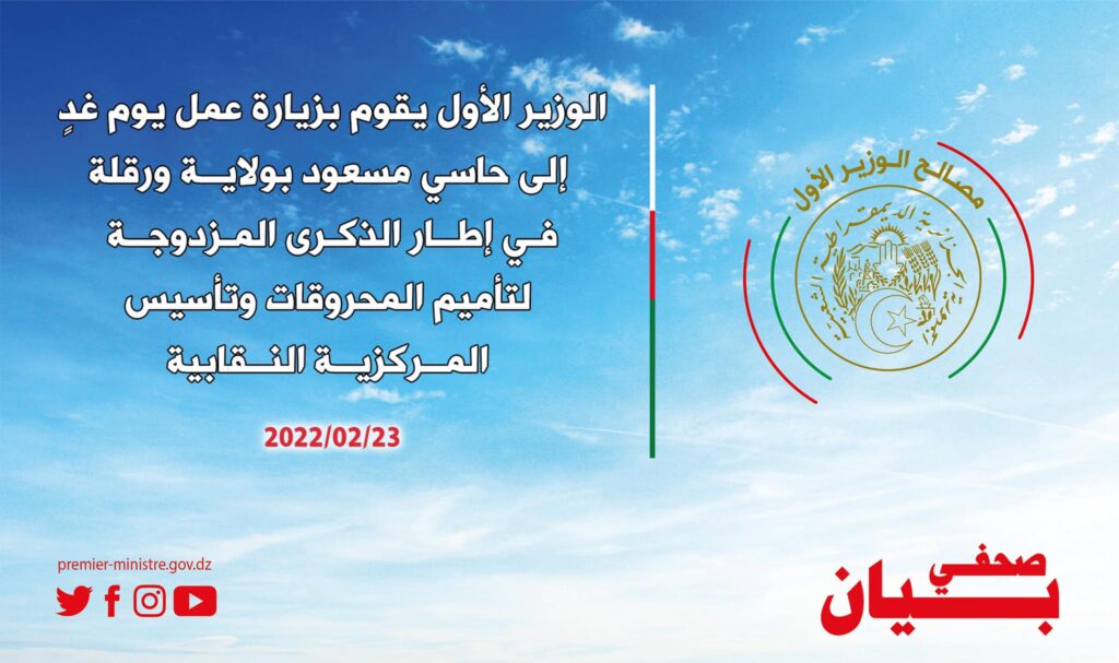 الوزير الأول أيمن عبد الرحمان يقوم يوم غد الخميس 24 فبراير2022 بزيارة عمل إلى حاسي مسعود بولاية ورقلة مرفوقا بالسيد عبد الحفيظ علاهم، مستشار رئيس الجمهورية، إلى جانب أعضاء من الحكومة، حيث سيشرف على الإطلاق الرسمي لمركز الفصل والضغط الوزير الأول سيشرف على الإطلاق الرسمي لمركز الفصل والضغط المخصص لمعالجة النفط والغاز وتفقد عدد من المنشآت الطاقوية.